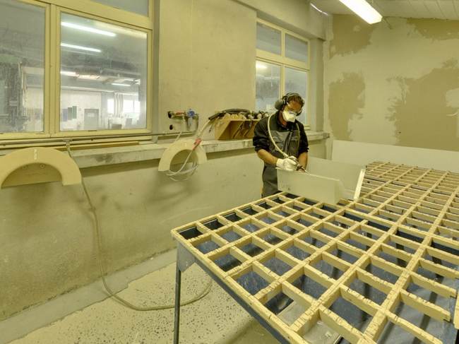 Après démoulage, le/la stratifieur/se découpe les contours et les ouvertures de la pièce et assure sa finition à l'aide d'outillages portatifs (disqueuse, perceuse, ponceuse). Il/elle assemble des pièces ou éléments de pièces par moulage.